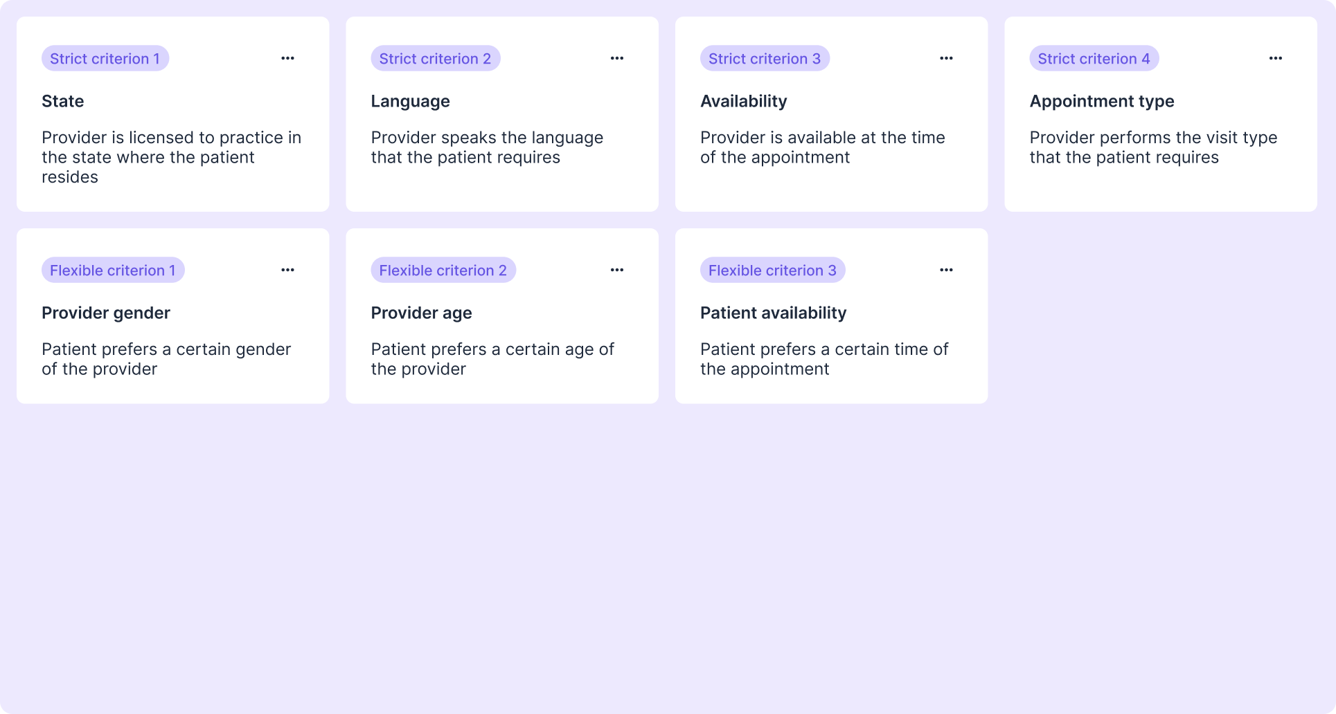Strict: Ensure precise alignment with specific requirements, such as language preferences, state licensure, or appointment type